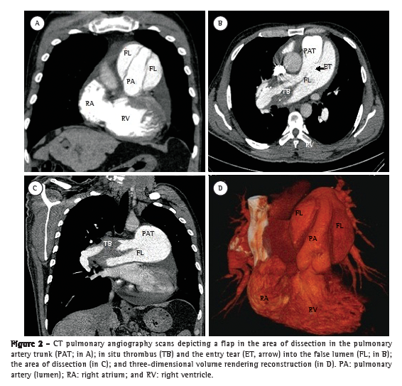 To our knowledge, this is only the second report of a case of pulmonary artery dissection in a patient with schistosomiasis-related pulmonary hypertension, the first such case having been diagnosed at autopsy.(6) Clinically, these cases present with aggravation of previous symptoms of dyspnea and chest pain. The chest pain is typically sharp and can mimic acute coronary syndrome or acute aorta dissection. Cyanosis can be present.(7) The diagnosis is often obtained postmortem, because most patients die suddenly due to cardiac tamponade or severe pulmonary bleeding. If the diagnosis is made antemortem, the first finding is the emergence of a flap in the lumen of the dilated pulmonary artery or trunk formed from the intimal layer, denoting the entry tear into the false lumen but rarely an exit, which is the opposite of what is found in cases of aortic dissection.(8) Magnetic resonance imaging or CTPA of the chest can confirm the diagnosis and the associated complications, such as an increase in pulmonary artery dilatation, bloody pleural fluid, and pulmonary opacities.(1) The evolution is usually rupture of the vessel with blood flowing into the mediastinum, pericardium, or lung, because there is no exit from the false lumen. The intimal tear that leads to the dissection occurs at the point of greatest dilatation as a consequence of an increased parietal tension. It has been reported that inflammation due to in situ thrombosis can play a synergistic role in the development of the intimal disruption.(4,9,10)