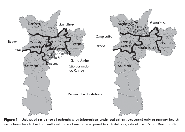 This suggests that, in some regions in the city of São Paulo and in neighboring cities, the network of health care services (hospitals and outpatient clinics) is partially activated, with limited access and limited effectiveness in diagnosing and treating TB. Data in the literature show some reasons for patients receiving medical treatment far from their place of residence, such as the result of previous positive experiences and their satisfaction regarding the health care clinic, leading to the continuity of the treatment and the interference with its efficacy.(16) The welcoming of patients to a given health care clinic when they need medical attention makes them faithful to that clinic, no matter how far it is, and the rate at which patients seek hospitals is explained by their expectation that their problems will be solved rapidly.(17)