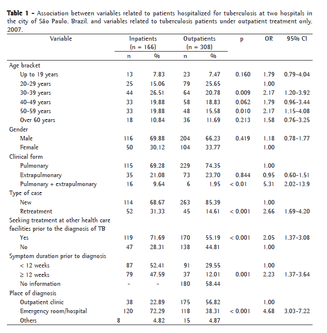 In 2007, a total of 474 TB patients were studied. Of those, 166 were inpatients and 308 were outpatients. The comparison of the sociodemographic data related to the patients treated in the two regions (at PHC clinics or at one of the two hospitals studied) revealed similarities between the inpatients and the outpatients.