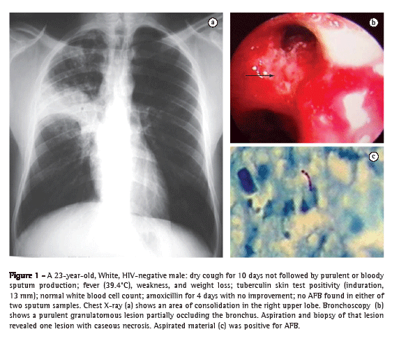 In our study, the clinical diagnosis of tuberculous pneumonia was suggested by the presence of dry cough preceding the other respiratory symptoms and the systemic symptoms. The radiographic findings of consolidation block and small discrete adjacent foci were also indicative of the condition. Although microbiological confirmation is usually made through sputum smear microscopy, it is occasionally necessary to collect samples by bronchoscopy, as it was in the present study. Because this type of lesion often contains few germs, multiple sputum examinations can be required in order to detect AFB.
