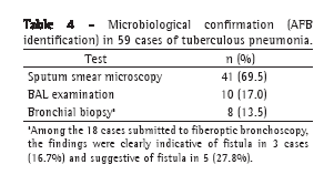 The findings were clearly indicative of fistula in 3 (16.7%) and suggestive of fistula (evidence of scarring) in 5 (27.8%). In all eight of those cases, the alterations were identified in large bronchi. In all 18 of the patients submitted to bronchoscopy, the microbiological diagnosis was made through examination of the biopsy fragment or of the BAL fluid (Table 4).