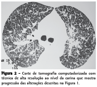 Os exames de imagem, realizados três meses antes em outro serviço (Figura 1) e no internamento (Figura 2), evidenciavam espessamento dos septos interlobulares e feixes broncovasculares, com a presença de múltiplos nódulos de distribuição perilinfática. Houve piora significativa das lesões pulmonares neste intervalo. A espirometria apresentava distúrbio ventilatório misto. O ecocardiograma mostrava câmaras cardíacas normais, com pressão sistólica de artéria pulmonar de 47 mmHg.
