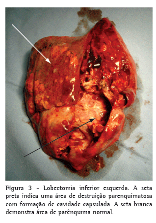 Ao exame, apresentava-se em bom estado geral, afebril, hemodinamicamente estável, com FC = 88 bpm e pressão arterial de 90-145 mmHg. A ausculta cardíaca era normal, e o exame pulmonar revelava expansibilidade e murmúrio vesicular diminuídos no terço inferior do hemitórax esquerdo, assim como macicez na percussão nesta região torácica. O restante do exame físico não revelava nenhuma anormalidade. Os exames laboratoriais de admissão, como hemograma, lipidograma, coagulograma, eletrólitos, função renal e hepática, eram normais. A VHS era de 32 mm/h. A sorologia para HIV foi negativa. A radiografia de tórax na internação demonstrava condensação no lobo inferior esquerdo no segmento posterior (Figura 1). Foi realizada TC do tórax com reconstrução em 2D, que demonstrava um ramo da aorta em direção à condensação pulmonar (Figura 2), compatível com o diagnóstico de sequestro pulmonar. O paciente foi encaminhado para cirurgia, tendo sido realizada lobectomia inferior esquerda para a ressecção do tecido pulmonar anômalo (Figura 3). Após a análise macroscópica da peça, caracterizou-se o sequestro intralobar. O paciente apresentou boa evolução pós-operatória, recebendo alta com acompanhamento ambulatorial.