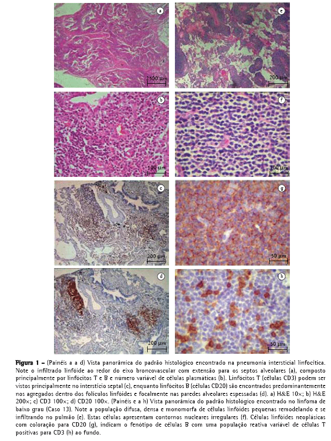 Pneumonia intersticial linfocítica (PIL) é um termo clínico-patológico histologicamente relacionado a infiltrado intersticial denso, composto principalmente por células T, células plasmáticas e histiócitos, sendo que centros germinais são freqüentemente identificados.(1-3) Essa doença se inclui no espectro das proliferações linfóides pulmonares, as quais variam desde a bronquite/bronquiolite folicular e a hiperplasia linfóide pulmonar (proliferações basicamente limitadas às vias aéreas) até o linfoma maligno de baixo grau.(4,5) Aparentemente, a PIL às vezes evolui para linfoma. Embora a freqüência dessa evolução provavelmente seja baixa, é difícil determiná-la, pois os linfomas de baixo grau podem simular a PIL.(3,4)