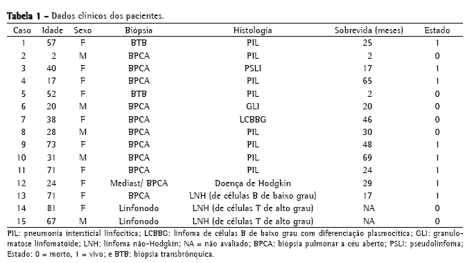 Este estudo foi aprovado pelo Comitê de Ética da Universidade de São Paulo. Blocos de parafina com quantidades suficientes de tecido foram coletados de nossos arquivos para a realização de cortes seriados para as preparações histoquímicas. Todas as biópsias haviam sido obtidas durante o atendimento clínico de rotina dos pacientes. A população do estudo foi composta por 9 casos (6 pacientes do sexo feminino e 3 do sexo masculino; mediana de idade de 41 anos). As amostras foram avaliadas por patologistas pulmonares experientes que verificaram que 8 dos casos apresentavam um padrão histológico compatível com PIL e que o caso restante apresentava um padrão histológico compatível com pseudolinfoma (Tabela 1). O diagnóstico foi baseado em achados clínicos e histológicos em biópsias (7 biópsias pulmonares cirúrgicas e 2 biópsias transbrônquicas) obtidas entre 1982 e 2002 e reclassificadas, de forma unânime, de acordo com a American Thoracic Society/European Respiratory Society International Multidisciplinary Consensus Classification of Idiopathic Interstitial Pneumonias. (24) Os casos de PIL secundária à síndrome de Sjögren ou à síndrome da imunodeficiência adquirida foram excluídos do estudo.