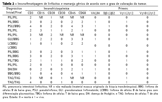 Objetivo: Determinar a utilidade, na prática rotineira, da análise da clonalidade dos linfócitos T e B nos tecidos pulmonares por reação em cadeia da polimerase no diagnóstico das doenças linfoproliferativas pulmonares. Métodos: Avaliaram-se, mediante análise imunohistoquímica e rearranjo molecular dos genes, 8 casos de pneumonia intersticial linfocítica (PIL) e 7 casos de doenças linfoproliferativas pulmonares. Resultados: Todos os 8 casos de PIL expressaram imunocoloração moderada a forte para CD3, em contraste com apenas 2 casos de linfoma e 1 caso de pseudolinfoma. Rearranjo gênico foi detectado em 4 de 8 casos de PIL, o que mudou o diagnóstico de PIL para linfoma, indicando, assim, a importância da detecção de rearranjo gênico em casos de PIL. Nesta situação, rearranjo gênico usando-se os pares de primers VH/JH e Vγ11/Jγ12 foi detectado em 3 e 1 casos de PIL, respectivamente, e não foram detectadas anormalidades gênicas usando-se as pares Dβ1/Jβ2 e Vγ101/Jγ12. Uma associação positiva foi detectada entre a intensidade de imunoexpressão CD20 e CD68 e rearranjo gênico usando-se o par de primers VH/JH. Antes do rearranjo gênico, 4 pacientes com PIL morreram rapidamente, enquanto que, após o rearranjo gênico, apenas 1 paciente com PIL morreu. Conclusões: A detecção de células B e T monoclonais por imunofenotipagem e reação em cadeia da polimerase mostrou impacto no diagnóstico de linfomas pulmonares em pacientes previamente diagnosticados com PIL. Portanto, imunofenotipagem e reação em cadeia da polimerase devem ser incluídas como métodos de 'padrão ouro' na rotina diagnósticObjetivo: Determinar a utilidade, na prática rotineira, da análise da clonalidade dos linfócitos T e B nos tecidos pulmonares por reação em cadeia da polimerase no diagnóstico das doenças linfoproliferativas pulmonares. Métodos: Avaliaram-se, mediante análise imunohistoquímica e rearranjo molecular dos genes, 8 casos de pneumonia intersticial linfocítica (PIL) e 7 casos de doenças linfoproliferativas pulmonares. Resultados: Todos os 8 casos de PIL expressaram imunocoloração moderada a forte para CD3, em contraste com apenas 2 casos de linfoma e 1 caso de pseudolinfoma. Rearranjo gênico foi detectado em 4 de 8 casos de PIL, o que mudou o diagnóstico de PIL para linfoma, indicando, assim, a importância da detecção de rearranjo gênico em casos de PIL. Nesta situação, rearranjo gênico usando-se os pares de primers VH/JH e Vγ11/Jγ12 foi detectado em 3 e 1 casos de PIL, respectivamente, e não foram detectadas anormalidades gênicas usando-se as pares Dβ1/Jβ2 e Vγ101/Jγ12. Uma associação positiva foi detectada entre a intensidade de imunoexpressão CD20 e CD68 e rearranjo gênico usando-se o par de primers VH/JH. Antes do rearranjo gênico, 4 pacientes com PIL morreram rapidamente, enquanto que, após o rearranjo gênico, apenas 1 paciente com PIL morreu. Conclusões: A detecção de células B e T monoclonais por imunofenotipagem e reação em cadeia da polimerase mostrou impacto no diagnóstico de linfomas pulmonares em pacientes previamente diagnosticados com PIL. Portanto, imunofenotipagem e reação em cadeia da polimerase devem ser incluídas como métodos de 'padrão ouro' na rotina diagnóstica.