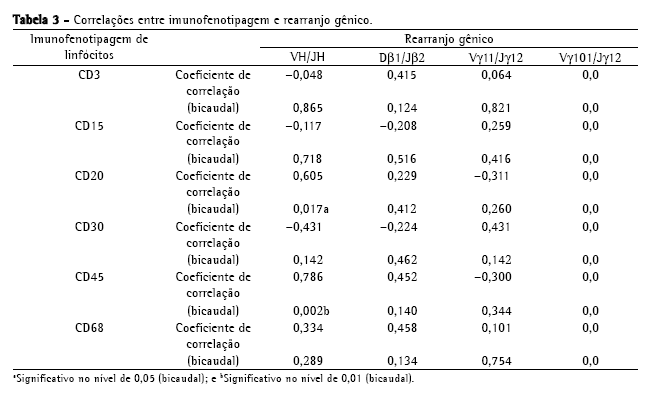 A Tabela 3 apresenta as associações entre imunofenotipagem e rearranjo gênico. Encontrou-se uma significativa associação positiva entre a intensidade da imunoexpressão CD20 e CD68 e rearranjo gênico usando-se o par de primers VH/JH (p = 0,01 e p = 0,002, respectivamente).