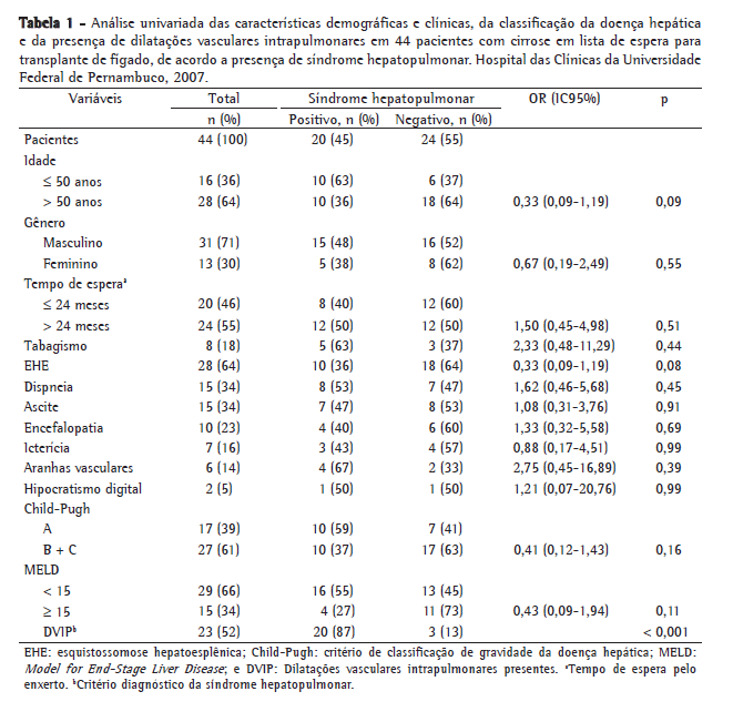 Objetivo: Verificar a ocorrência da síndrome hepatopulmonar (SHP) em pacientes cirróticos candidatos a transplante de fígado; comparar as características demográficas, clínicas, laboratoriais e espirométricas, resultados de ecocardiografia, análise de gases arteriais e da gravidade da doença hepática nos pacientes com e sem SHP; e descrever a ocorrência de SHP no subgrupo de pacientes com cirrose associada à esquistossomose mansônica (doença hepática mista). Métodos: Entre janeiro e novembro de 2007, foram avaliados 44 pacientes inscritos no Ambulatório de Transplante Hepático do Hospital das Clínicas da Universidade Federal de Pernambuco, em Recife (PE). Os critérios diagnósticos para SHP foram a presença de dilatações vasculares intrapulmonares, identificadas por ecocardiografia transtorácica, assim como diferença alveoloarterial de oxigênio ≥ 15 mmHg ou PaO2 < 80 mmHg. Resultados: A idade média foi 52 anos, e 31 pacientes (70%) eram do sexo masculino. A causa mais frequente de cirrose foi uso de etanol. A esquistossomose esteve presente em 28 pacientes (64%). Dos 44 pacientes, 20 (45,5%) foram diagnosticados com SHP. Não foram observadas diferenças significativas em relação às características estudadas. No subgrupo de pacientes com cirrose associada à esquistossomose, 10/28 (35,7%) receberam o diagnóstico de SHP. Conclusões: A SHP apresentou elevada prevalência nesta população estudada, não sendo observadas associações entre a sua ocorrência e as variáveis analisadas.