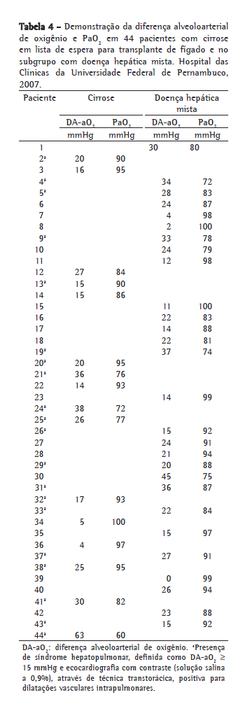 Dos 44 pacientes avaliados, 20 (45,5%) preencheram os critérios para o diagnóstico de SHP, com Eco-TT positivo para DVIP e DA-aO2 ≥ 15 mmHg ou PaO2 < 80 mmHg. Todos os 7 pacientes com PaO2 < 80mmHg e DVIP apresentaram DA-aO2 ≥ 15 mmHg (Tabela 4). A classificação da síndrome de acordo com o grau de hipoxemia demonstrou que 13 pacientes (65%) tinham a forma leve (PaO2 ≥ 80 mmHg) e 7 (35%) tinham a forma moderada (60 mmHg ≤ PaO2 < 80 mmHg). Não foram encontrados pacientes com a forma grave ou muito grave da síndrome.