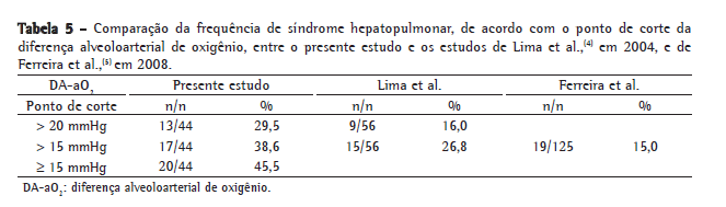 Em nossa série, a ocorrência da síndrome foi de 45,5% (20/44), 38,6% (17/44) e 29,5% (13/44) ao se considerar como pontos de corte DA-aO2 ≥ 15 mmHg, > 15 mmHg e > 20 mmHg, respectivamente. Em todos os diferentes parâmetros de DA-aO2 analisados, os resultados foram superiores aos encontrados em outros estudos (Tabela 5).(4,21) Um dos fatores que difere na série em questão é a ocorrência de DHM em 64% dos pacientes (Tabela 1), o que não foi relatado em outros estudos sobre a prevalência da SHP em candidatos ao transplante de fígado, embora o pequeno número de pacientes não tenha sido suficiente para demonstrar uma associação dessa variável em relação à ocorrência de SHP.