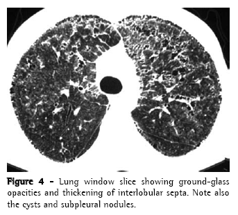 The diagnosis was based on the patterns observed on X-rays and tomography scans, which are considered pathognomonic of the disease.(1,3-5) However, six patients were also submitted to open lung biopsies, which allowed histopathological confirmation.