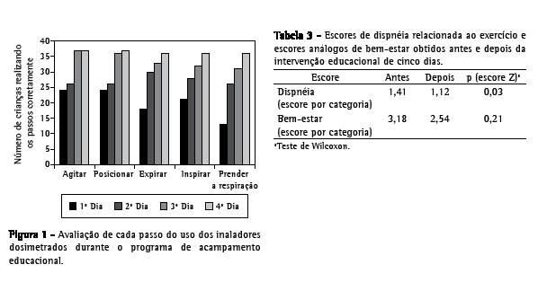 Em nosso estudo, cerca de metade das crianças não estavam cientes de que podiam participar ativamente em esportes. Durante o programa de acampamento educacional, elas aprenderam que as crianças asmáticas podem realizar exercícios físicos após o uso do broncodilatador. Elas passaram a entender as diferenças entre o efeito antiinflamatório e o efeito broncodilatador dos medicamentos para asma, assim como o uso dos broncodilatadores como uma medicação preventiva para os sintomas de asma. Por causa dessa nova consciência, observamos uma redução significativa no escore da dispnéia relacionada ao exercício. Casas Vilá et al. e Cerdá et al. obtiveram resultados semelhantes durante um programa de acampamento educacional na Espanha.(11,12)