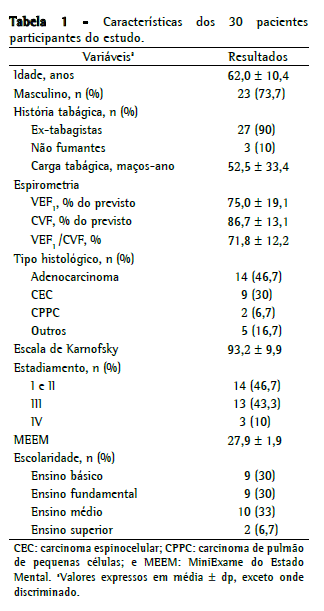 Este é um estudo observacional, prospectivo, no qual foram incluídos 30 pacientes com diagnóstico de neoplasia de pulmão e em acompanhamento no Ambulatório de Oncopneumologia da Disciplina de Pneumologia, Universidade Federal de São Paulo/Escola Paulista de Medicina, São Paulo (SP). Foram considerados como critérios de inclusão deste estudo o diagnóstico de neoplasia de pulmão, confirmado citológica ou histologicamente, a estabilidade clínica (ausência de mudanças nos sintomas de tosse, expectoração ou dispneia, dados esses inseridos em uma ficha estruturada de acompanhamento ambulatorial, indicando também a ausência de modificações no esquema terapêutico ou de internações nos 10 dias que antecederam a entrevista) e pontuação maior ou igual a 21 no MiniExame do Estado Mental (MEEM).(8) O estudo foi previamente aprovado pelo comitê de ética da instituição e todos os participantes assinaram o termo de consentimento livre e esclarecido.