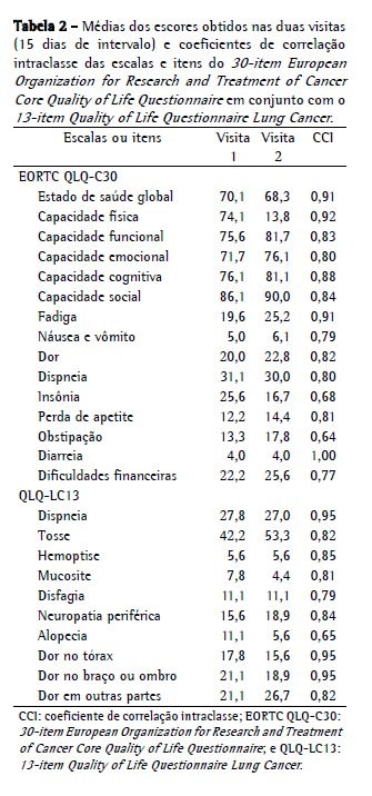 Foi observada excelente reprodutibilidade intraobservador para todos os escores do questionário EORTC QLQ-C30+QLQ-LC13 (Tabela 2). Todos os CCI apresentaram p < 0,01.