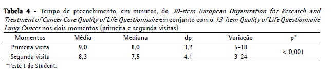 O EORTC QLQ-C30 em uso associado ao QLQ-LC13, neste estudo, levou, em média, menos de dez minutos para ser completado. Isso ocorreu pela simplicidade das questões e de opções de respostas, e os pacientes consideraram esse instrumento de fácil entendimento. O tempo de resposta na segunda visita foi menor que na primeira. Esse fato pode estar relacionado à familiarização do paciente com a utilização de questionários, pois, para a maioria dos entrevistados, esse fora o primeiro contato com instrumentos desse tipo. Como a avaliação da qualidade de vida geralmente se faz de forma contínua, a familiarização diminui o tempo gasto e, consequentemente, o trabalho tanto da equipe de saúde, quanto do próprio paciente.