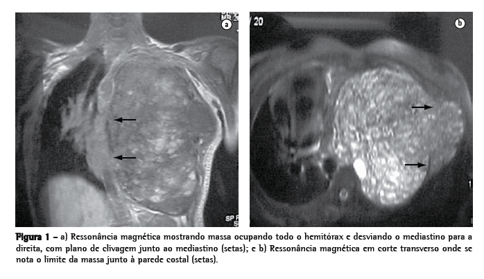 A ressonância magnética do tórax revelou uma formação expansiva mista e heterogênea e limites bem definidos. Uma massa multiloculada, com áreas com sinal hiperintenso em T1 correspondendo a focos de hemorragia, ocupava todo o hemitórax esquerdo, comprimindo e desviando as estruturas mediastinais e o diafragma. Havia um pequeno componente de lesão extratorácica aproximadamente ao nível da linha axilar (Figura 1).