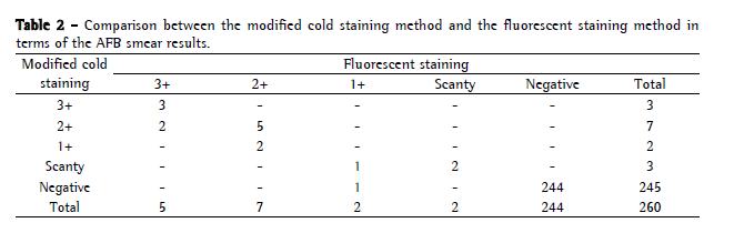 Objetivo: Em países em desenvolvimento, a baciloscopia é a principal ferramenta para a identificação de casos de tuberculose pulmonar. O objetivo do presente estudo foi avaliar a eficácia diagnóstica do método de coloração de Gabbett (MCG) e de um método modificado de coloração a frio (MMC), ambos em duas etapas, em comparação com a do método de coloração fluorescente (MCF), em três etapas, para a detecção de BAAR em esfregaços de escarro. Métodos: Nossa amostra consistiu de 260 amostras de escarro coletadas de casos suspeitos de tuberculose pulmonar no Kasturba Hospital, em Manipal, Índia. Os esfregaços foram preparados em triplicata, para cada um dos métodos: MCF, MMC e MCG. As lâminas foram numeradas aleatoriamente a fim de que o examinador fosse cegado quanto à identidade das amostras. Resultados: Das 260 amostras, 16 (6,15%), 15 (5,77%) e 13 (5,00%) foram positivas para BAAR com MCF, MMC e MCG, respectivamente. A sensibilidade de MCG e MMC em relação à de MCF foi de 81,25% e 93,75%, respectivamente. Houve boa concordância de MCG e MMC com MCF (0,988 e 0,996, respectivamente), e não houve diferenças estatísticas significativas. Conclusões: Embora MCG e MMC apresentaram menor sensibilidade que MCF, que é avaliado por microscopia de fluorescência, consideramos que os dois primeiros métodos sejam promissores no diagnóstico de tuberculose.