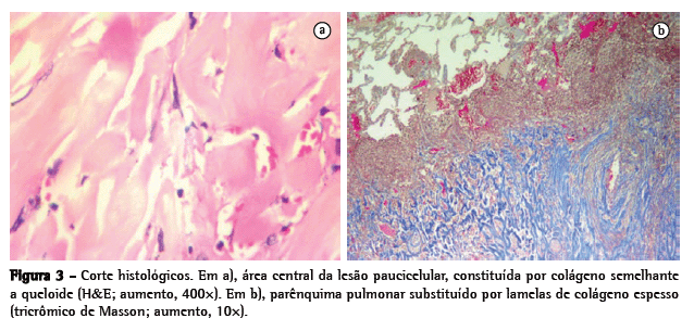 A broncoscopia com biópsia não forneceu nenhum aspecto relevante ao diagnóstico. Foi submetido à nova toracotomia com o intuito de realizar a exérese da massa. O exame macroscópico do lobo retirado revelou a presença de massa bem delimitada, de coloração branco-acinzentada, de consistência firme, com áreas pétreas e medindo 10,0 × 4,0 × 3,5 cm (Figura 2). À microscopia, foi observado parênquima pulmonar com extensa fibrose de aspecto hialinizado, áreas de calcificação e focos de metaplasia óssea (Figura 3). Na periferia da lesão, observou-se moderado infiltrado inflamatório linfoplasmocitário com formação de agregados linfoides, alguns granulomas do tipo corpo estranho e focos de bronquiolite obliterante/pneumonia em organização. As pesquisas para material birrefringente sob luz polarizada, fungos, BAAR e substância amiloide foram negativas. Os achados anatomopatológicos foram compatíveis com granuloma hialinizante. No pós-operatório, o paciente apresentou vários episódios de broncoespasmo que foram revertidos com medicação sintomática. Foi mantido com prednisona na dose de 40 mg/dia com boa evolução clínica até o presente momento.