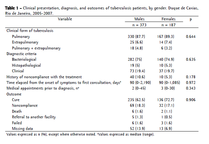 There were no differences between the genders regarding the clinical form of tuberculosis, diagnostic criteria, history of treatment noncompliance, median number of days since the onset of symptoms, number of medical appointments prior to the diagnosis of tuberculosis, or outcome (Table 1).