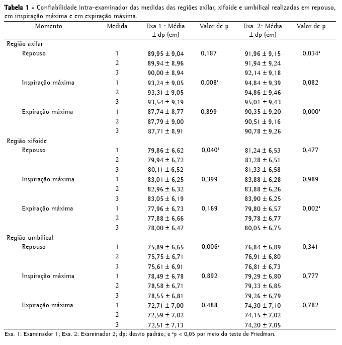 Os dados relativos ao repouso representam a média dos três ciclos respiratórios imediatamente anteriores à inspiração máxima. Foram analisados 2.160 ciclos respiratórios em repouso, num total de 720 medidas, visto que cada três ciclos foram transformados em uma única medida (média), e 720 ciclos respiratórios em inspiração máxima. A Tabela 1 mostra os resultados relativos à confiabilidade intra-examinador. Em relação ao examinador 1, foi encontrada diferença significativa entre as três medidas realizadas na região axilar (em inspiração máxima) e entre as três medidas realizadas nas regiões xifóide e umbilical (em repouso), não havendo diferença entre as três medidas realizadas nas demais situações. Em relação ao examinador 2, foram detectadas diferenças significativas entre as três medidas realizadas na região axilar (em repouso e em expiração máxima) e entre as três medidas realizadas na região xifóide (em expiração máxima), não havendo diferença entre as três medidas realizadas nas outras situações. Para ambos os examinadores, observou-se que, onde ocorreu diferença significativa, a diferença média máxima foi sempre inferior a 0,5 cm.