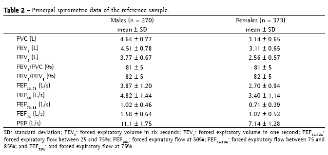 In Brazil, spirometric reference values in the adult population were obtained for white individuals in 1992.(4) Predicted values for volume-time curves were obtained using bellows spirometers. In the past years, flow spirometers have become highly accurate and are currently the most widely used. A new parameter for the detection of airflow obstruction, the ratio between forced expired volume in one second and forced expired volume in six seconds (FEV1/FEV6), has been suggested.(5) There are no reference values available for this ratio in Brazilians.