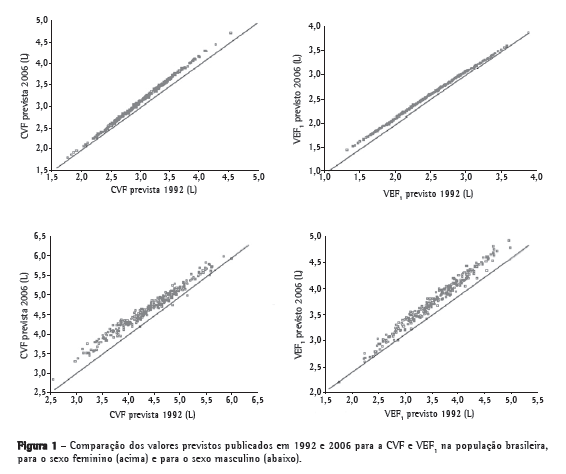 Em conclusão, novos previstos para a espirometria foram obtidos em uma amostra ampla da população brasileira. Esses valores se mostraram superiores aos valores publicados em 1992, o que provavelmente decorre de fatores técnicos. Também estão agora disponíveis valores para a relação VEF1/VEF6 e fluxos instantâneos.