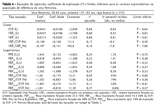 Para o VEF1, CVF, VEF6 e suas relações houve melhor ajuste com equações lineares, enquanto que para os fluxos e suas relações com a CVF o melhor ajuste se deu através de equações logarítmicas. As equações de predição são mostradas na Tabela 3 para o sexo masculino e na Tabela 4 para o sexo feminino. Diversos achados merecem destaque. O peso influenciou os valores previstos para a CVF, VEF1 e VEF6 no sexo masculino, mas não teve influência no sexo feminino. Na Tabela 3, os valores previstos são mostrados com e sem a adição do peso às equações no sexo masculino. A estatura influenciou negativamente os valores previstos para as relações VEF1/CVF, VEF1/VEF6 e fluxos/CVF em ambos os sexos.
