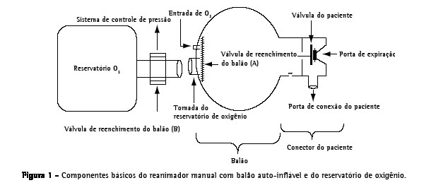 Os reanimadores manuais com balão auto-inflável têm duas partes principais: o balão e a porta de conexão do paciente (Figura 1). O balão é a parte que é comprimida pelo operador para fornecer volume de ar ao paciente. A porta de conexão do paciente, à qual a máscara ou o tubo endotraqueal podem ser conectados, localiza-se na parte anterior da unidade.