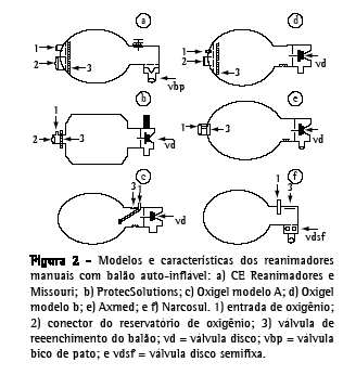 Esses sete reanimadores manuais com balão auto-inflável podem ser agrupados de acordo com as seguintes características (Figura 2): possibilidade ou não de ter um reservatório de oxigênio acoplado, sentido do fluxo de entrada de oxigênio no balão, e tipo de válvula do paciente. Os reanimadores manuais com balão auto-inflável fabricados por CE Reanimadores, Oxigel (modelo B), Missouri e ProtecSolutions podem ser acoplados a um reservatório de oxigênio, enquanto aqueles fabricados por Axmed, Oxigel (modelo A) e Narcosul não podem. Como também se pode ver na Figura 2, o sentido do fluxo de entrada no balão segue três padrões diferentes (paralelo à válvula de reenchimento do balão, perpendicular à válvula de reenchimento do balão e diretamente dentro do balão), e há três tipos de válvula do paciente (válvulas disco, válvulas bico de pato e válvulas disco semifixas).