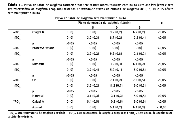 Objetivo: Determinar o fluxo de saída de oxigênio fornecido por sete modelos diferentes de reanimadores manuais com balão auto-inflável