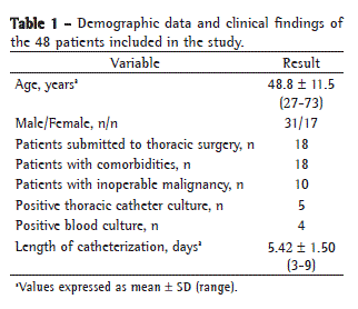 Demographic and clinical data are displayed in Table 1. Of the 48 patients, 17 were female and 31 were male. The mean age of the patients was 48.8 ± 11.5 years (range, 27-73 years). Of the 48 patients, 18 (37.5%) had undergone thoracic surgery: tumor excision, in 14; lung volume reduction, in 2; or esophagectomy, in 2. The TC samples collected from 3 of the patients showed bacterial growth (positive culture), as did the blood samples collected from 2 other patients. In another 2 patients, positive cultures were obtained in both types of samples (TC and blood). One of those 2 patients showed clinical signs of infection (Klebsiella pneumoniae proliferation), and the infection was managed with appropriate antibiotic therapy. No clinical complications, pleural reactions, or increases in drainage were observed in the other 47 patients.