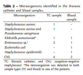 Hospitals, and intensive care units in particular, are the most suitable settings for the emergence and transmission of antibiotic-resistant bacteria.(13) Catheters can be a route of transmission, as well as providing an environment for bacterial growth. Catheters can be a direct route of transmission for pathogenic microorganisms to migrate from the skin into the blood,(5) and such organisms can directly infiltrate the thorax via a catheter. The thoracic cavity, like the blood, can be a pathway for the dissemination of microorganisms. In patients catheterized with TCs, infection at the access site and pleurocutaneous fistula have been reported.(14,15)