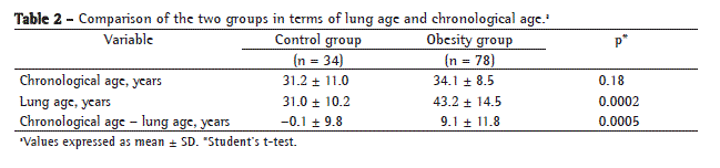 When we analyzed mean lung age and mean chronological age in each group in isolation, we found that, in the control group, there was no statistically significant difference between mean lung age (31.0 ± 10.2 years) and mean chronological age (31.2 ± 11.0 years), the difference between these means being −0.1 ± 9.8 years (p = 0.93). However, in the obesity group, there was a significant difference between mean lung age (43.2 ± 14.5 years) and mean chronological age (34.1 ± 8.5 years), the difference between these means being 9.1± 11.8 years (p < 0.0001; 95% CI: 6.6-11.9 years; Table 2).