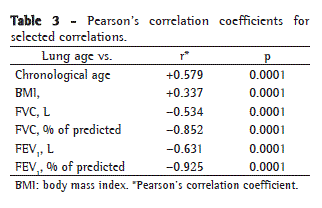 Lung age correlated positively with chronological age and BMI, whereas it correlated negatively with the spirometric variables in absolute values and in percentage of predicted, with statistical significance (p < 0.0001; Table 3).