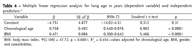 Pearson's correlation coefficient was calculated to assess the associations between lung age and the following variables: chronological age; BMI; FVC; and FEV1 . For the selection of the independent variables, we used stepwise multiple linear regression. The dependent variable was lung age, whereas the four independent variables were chronological age, BMI, gender, and the presence of comorbidities. The assumptions of normal distribution, homogeneity, and independence of errors were satisfied in accordance with established guidelines.(15) The level of statistical significance was set at p < 0.05, and all statistical tests were two-tailed.