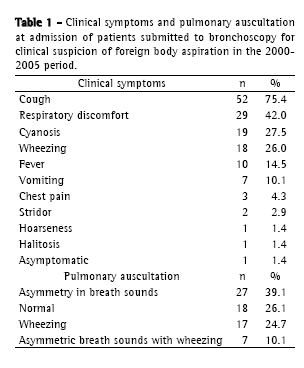 The Hospital das Clínicas da Universidade Estadual de Campinas (HC-Unicamp, State University at Campinas Hospital das Clinicas), located in the state of São Paulo, is a referral center for the bronchoscopic treatment of FBA. The evaluation of clinical and radiological findings, as well as the bronchoscopy results of patients submitted to this procedure in recent years, might help to establish the profile of these accidents. Such knowledge can serve to inform pediatricians not only regarding the most common clinical manifestations of FBA but also of preventive measures aimed at the target population.