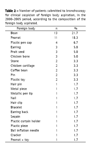 We evaluated the records of 116 patients under the age of 14 who were submitted to bronchoscopy between January of 2000 and December of 2005. Of those 116 patients, 69 were evaluated for suspicion of FBA and were selected for study.