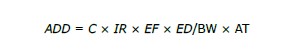 where ADD is the average daily dose; C is the indoor concentration; IR is the inhalation rate (20 m3/day); EF is the exposure frequency (8 h/day, i.e., 0.333 days/day); ED is the exposure duration (30 years); BW is the body weight (70 kg); and AT is the average time (30 × 365 = 10,950 days).