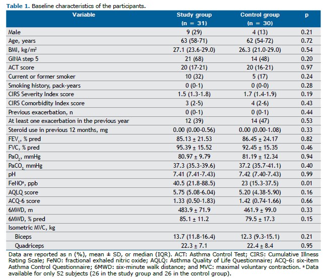 Our study has some limitations. First, there was a statistically significant difference between the SG and CG in terms of the FeNO at baseline. That can be explained by the presence of a few SG participants with very high FeNO values, despite the fact that the proportion of participants in whom eosinophilic inflammation exceeded the 25 ppb threshold did not differ significantly between the two groups. In addition, a recent meta-analysis concluded that FeNO-guided asthma treatment probably results in fewer exacerbations but may not have clinically relevant effects on other asthma outcomes.(40) Therefore, we are confident that this difference has not biased our results. Furthermore, the use of anklets and wristbands in place of gym machines (unavailable at our facility), particularly for the lower extremity exercises, may have limited the effectiveness of the ST. However, the combination of simple, low-cost equipment and the detailed description of the treatment following the CERT guidelines(16) makes our program easily replicable and adaptable, even in home or resource-limited settings. Another limitation of our study is the use of the exacerbation rate as the only long-term outcome measure. However, collecting additional relevant outcomes, such as health care resource utilization and lost workdays, would have required a health care data collection system that is not readily available in our country. Finally, the single-center design may have limited the generalizability of the results. However, the use of nonparametric statistical methods and repeated analyses, employing both intention-to-treat and per-protocol approaches, with and without adjustments for baseline values, increased the robustness of our results.