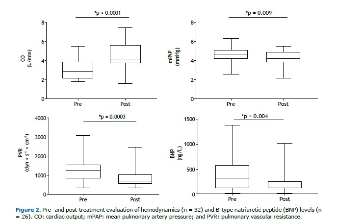Other key findings in our study include improvements in functional class and BNP levels, which are consistent with those of other studies.(11,12) One of the aforementioned studies(11) showed a 622 ng/L reduction in N-terminal pro-BNP levels, whereas the other(12) showed a 291 ng/L reduction, both being consistent with our observed improvements in BNP levels and functional class.(11,12)