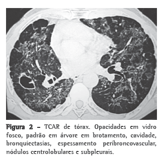 Na TCAR (Figura 2), podem ser visualizados nódulos, opacidades em vidro fosco, aspecto em árvore em brotamento, lesões acinares, bandas parenquimatosas, espessamento do interstício peribroncovascular, cavidades, reticulosidades, sinal do "halo invertido", enfisema paracicatricial e bronquiectasias de tração.(8,9)