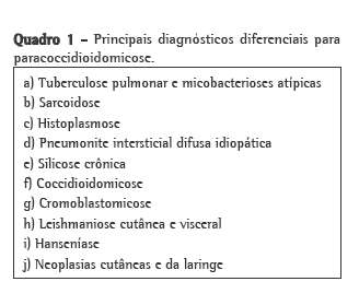 Diagnóstico diferencialO principal diagnóstico diferencial é com tuberculose pulmonar, muito semelhante à paracoccidioidomicose em relação às alterações radiográficas e às manifestações clínicas (Quadro 1). O que define o diagnóstico é a presença, nos espécimes analisados, do fungo (paracoccidioidomicose) ou do bacilo de Koch (tuberculose). Tuberculose e paracoccidioidomicose podem comprometer um mesmo indivíduo, e essa associação ocorre em 5,5-19% dos casos, tornando mais difícil o diagnóstico de ambas as doenças.(4,6)