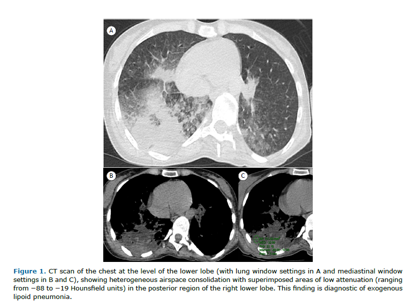 1.           Marchiori E, Zanetti G, Mano CM, Hochhegger B. Exogenous lipoid pneumonia. Clinical and radiological manifestations. Respir Med. 2011;105(5):659-666. https://doi.org/10.1016/j.rmed.2010.12.001