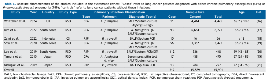This systematic review and meta-analysis evaluated the prevalence of fungal pulmonary infections (CPA and PJP) in 15,901 lung cancer patients across seven studies, identifying 312 cases. Key clinical associations were also explored to support risk stratification and management.