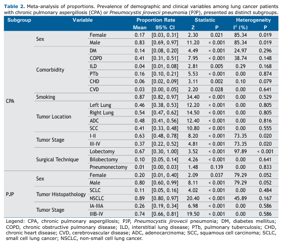 Table 2 presents the results of the meta-analysis of proportions for demographic and clinical factors among lung cancer patients with CPA and PJP. Corresponding forest plots are shown in Supplementary Figures S2–S25.