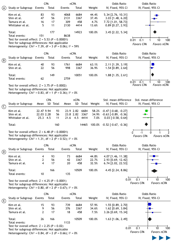 For body mass index (BMI), a continuous variable, the meta-analysis yielded a statistically significant standardized mean difference (SMD) of -0.52 (95%CI: [-0.67 to -0.36]), indicating lower mean BMI in CPA patients compared to non-CPA patients. Heterogeneity was generally low for most statistically significant results, except for male sex and COPD, which showed moderately high levels of heterogeneity (I² > 60%).