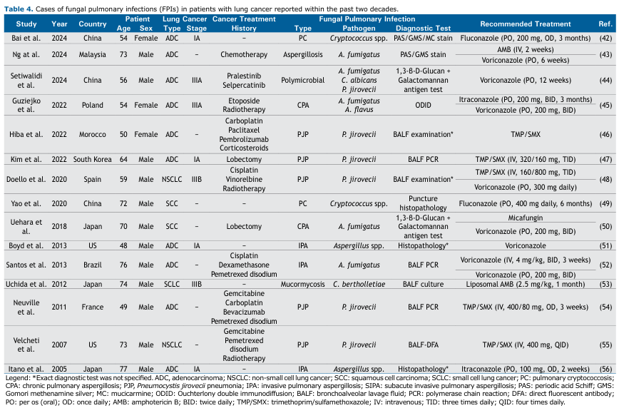 In routine practice, FPIs in lung cancer are investigated only when clinical or radiologic findings—such as new infiltrates, persistent fevers, or nodular lesions—raise suspicion, rather than through universal screening.(57,58) For PJP, current guidelines recommend initiating prophylaxis once patients receive the equivalent of ≥20 mg prednisone daily for ≥4 weeks or,(60) according to the 2022 European Alliance of Associations for Rheumatology (EULAR) update, ≥15 mg daily for ≥2 weeks.(57) Trimethoprim sulfamethoxazole (TMP/SMX) remains the first line regimen, with dosing adjusted for renal function and desensitization protocols available for sulfa allergic patients. Its efficacy is well supported, including in a recent risk-benefit analysis of primary prophylaxis against PJP involving 419 patients receiving TMP/SMX.(61) Within lung cancer-associated case reports (Table 4), TMP/SMX consistently appears as the predominant treatment modality for PJP, reinforcing its central role. By contrast, CPA typically arises from structural lung damage—such as post radiotherapy pneumonitis or bilobectomy—and routine antifungal prophylaxis is neither standard nor practical given concerns about toxicity, drug interactions, and cost. (57) Instead, our findings suggest a risk stratified surveillance approach: patients undergoing high risk interventions, including bilateral lung resections or CCRT, may benefit from scheduled chest imaging or serum biomarkers (e.g., galactomannan, Aspergillus PCR; see Table 1) in the months following treatment to enable earlier CPA detection. Together, these observations support targeted PJP prophylaxis and individualized CPA monitoring strategies to optimize fungal infection management in lung cancer care.