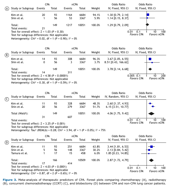 As shown in Figure 3, chemotherapy was not significantly associated with CPA in patients with lung cancer (OR: 1.29; 95%CI: [0.79–2.09]). In contrast, chest radiotherapy showed a significant association with CPA (p<0.001), with a pooled OR of 3.78 (95%CI: [2.14–6.68]) and negligible heterogeneity (I² = 0%). Concurrent chemoradiotherapy (CCRT) also showed a significant association (p=0.001), with a pooled OR of 4.06 (95%CI: [1.75–9.42]), though with substantial heterogeneity (I² = 75%).