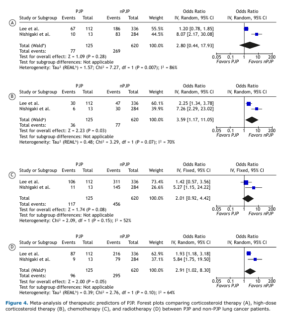 High-dose corticosteroids (≥20 mg/day) were strongly associated with PJP, whereas lower dosages showed non-significant trends. The association between corticosteroid therapy and PJP is well-established in the literature.(39) Our analysis revealed a pooled mean OR of 2.80 (95%CI: [0.44–17.93]; Figure 4) for PJP in patients with a history of corticosteroid treatment, irrespective of dosage; however, this association did not reach statistical significance. In contrast, daily doses ≥20 mg were significantly associated with PJP. This finding is clinically relevant, as demonstrated by the 2024 PCP-MULTI group study, which reported that among 66 solid tumor patients with PJP, 44 (66.7%) were receiving corticosteroids at daily doses ≥40 mg at the time of infection. High-dose corticosteroid use was linked to significantly lower survival.(40) Collectively, these data support a dose-dependent risk of PJP, highlighting the importance of prophylaxis in patients receiving high-dose corticosteroid therapy.(41)