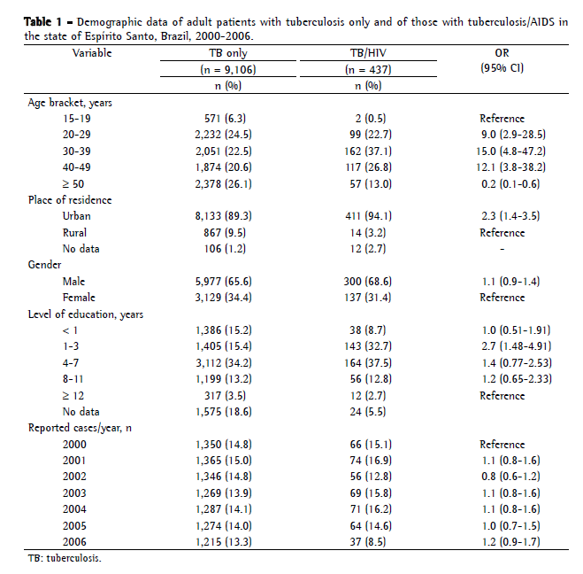 The prevalence of TB/AIDS in the population studied is similar to that reported in other studies conducted in Brazil and other regions.(16-18) It has been reported that TB/HIV co-infection is significantly associated with being in the 30-39 age bracket, with having a low level of education, with living in an urban area, and with having extrapulmonary TB. After the onset of AIDS, extrapulmonary forms of TB are known to have become more common in TB patients.(19,20)